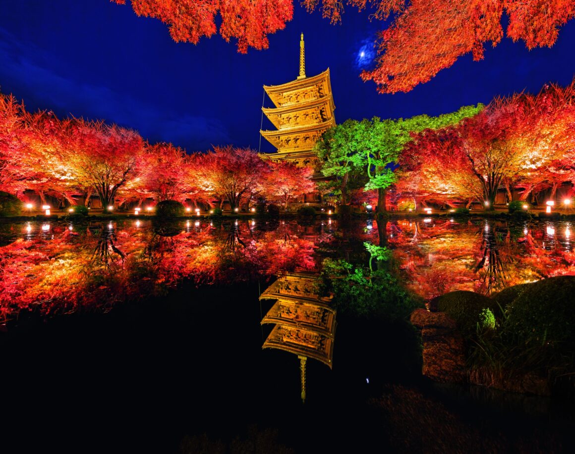 Discover the beauty of autumn at Toji Temple in Kyoto, where vibrant maple leaves reflected on the pond’s surface.
