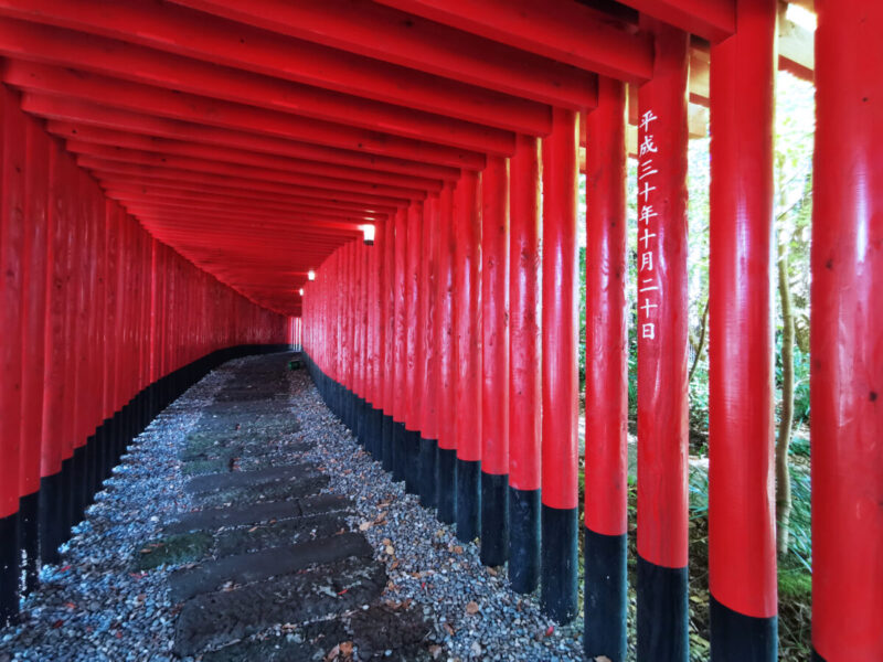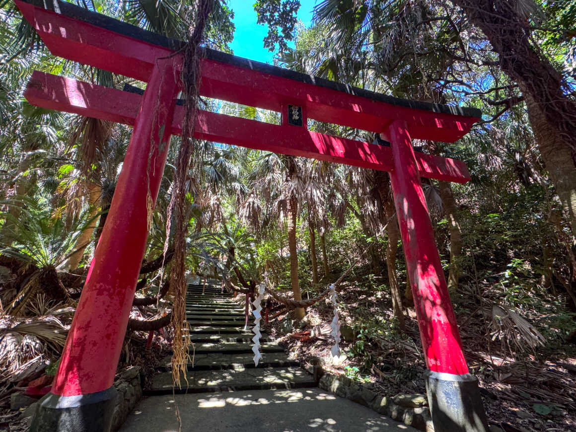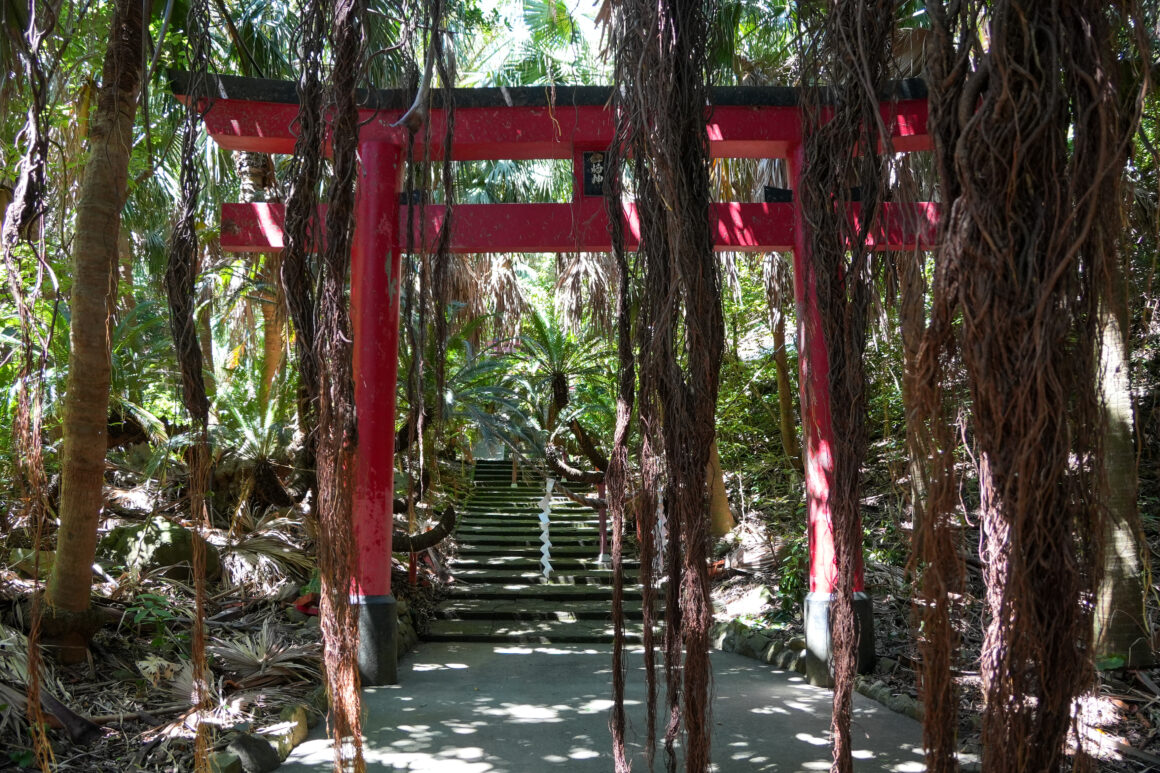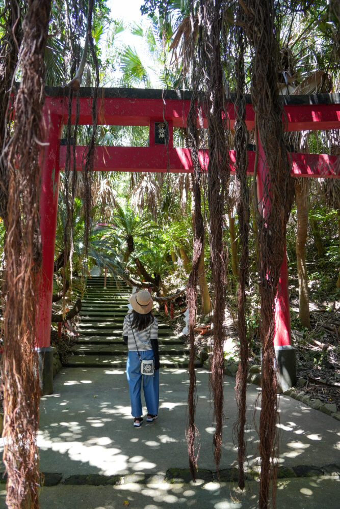 โดยทางเข้าศาลเจ้านั้นค่อนข้างดูแปลกตา ด้านข้างรายล้อมไปด้วยต้นไม้เขตร้อนและมีต้นไทรย้อยลงมาคลุมเสาโทริอิเต็มไปหมด จนไม่คิดว่าที่นี่จะเป็นศาลเจ้าในญี่ปุ่นเลยทีเดียว
