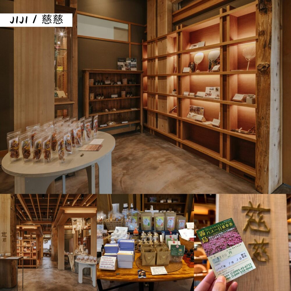 “จิจิ” (JiJi / 慈慈) เป็นร้านที่รวบรวมงานฝีมือแบบดั้งเดิมของคาโกชิม่า เมืองคิริชิมะ และทั่วประเทศญี่ปุ่น โดยจะสื่อถึงคุณค่าของ “อาหารและการทำงาน” ทางร้านได้มีการคัดสรรสินค้ามาอย่างดี ตั้งแต่สินค้าที่มีชิ้นเดียวในโลกไปจนถึงงานออกแบบดั้งเดิม นอกจากนี้ยังมีบริการต่างๆ เช่น บริการรับฝากสัมภาระ บริการเช่าจักรยาน และบัตรโดยสารรถประจำทางแบบรายวันอีกด้วย