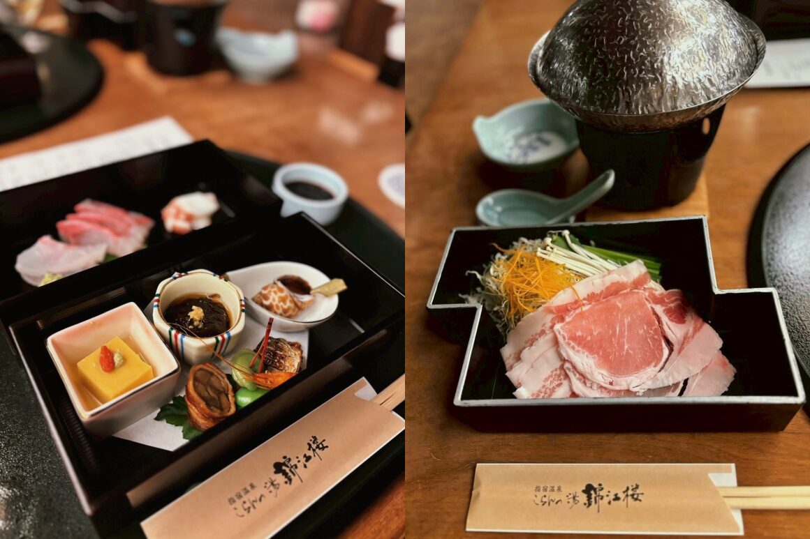 อาหารเย็นและอาหารเช้าจะเสิร์ฟที่ห้องอาหารบนชั้น 2 ของโรงแรม สำหรับอาหารเย็นก็มีเมนูหลักให้เลือกหลากหลาย ไม่ว่าจะเป็น ชาบูหมูดำคาโกชิม่า ซาชิมิที่จับได้จากอ่าวคินโคะ วัวดำคาโกชิม่า หรือไก่ดำอันเลื่องลือ ซึ่งเสิร์ฟมาพร้อมเครื่องเคียงที่ปรุงด้วยวัตถุดิบท้องถิ่นของคาโกชิม่า และปิดท้ายมื้อค่ำด้วยขนมหวาน