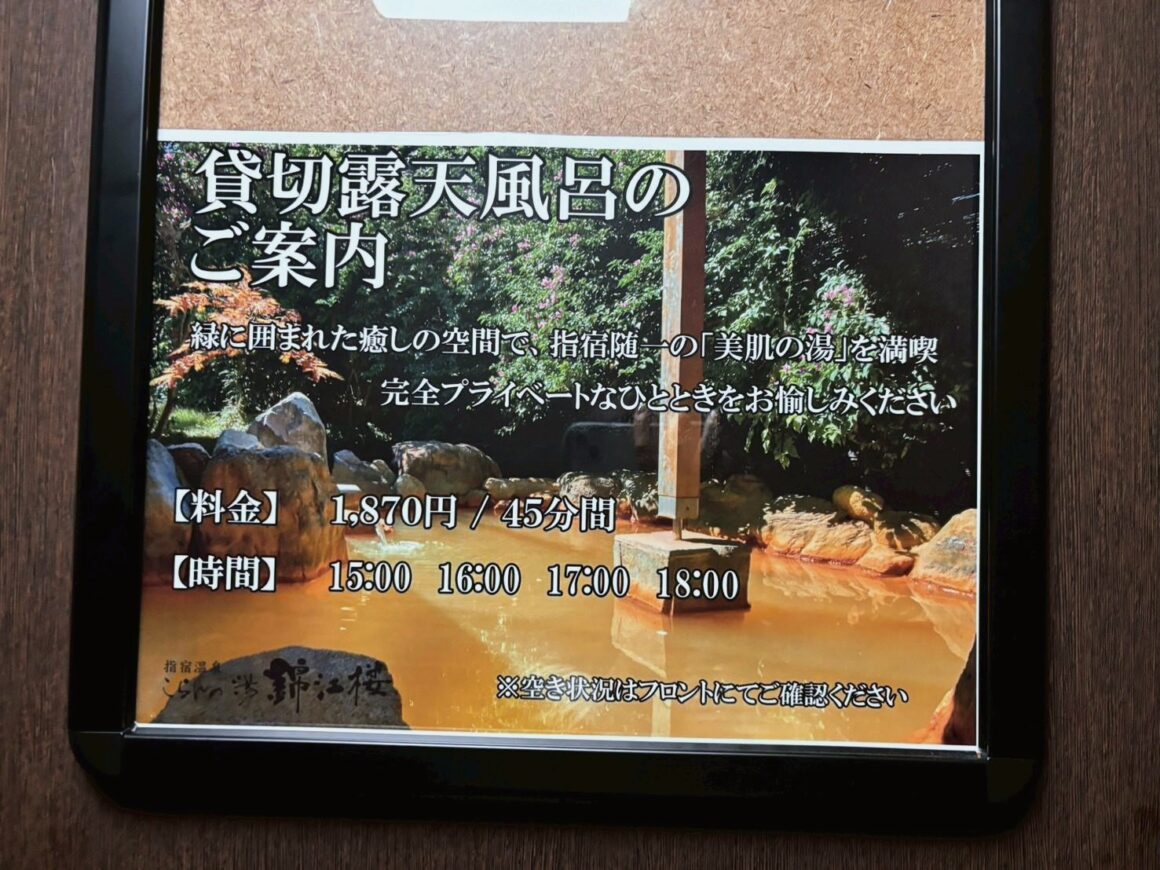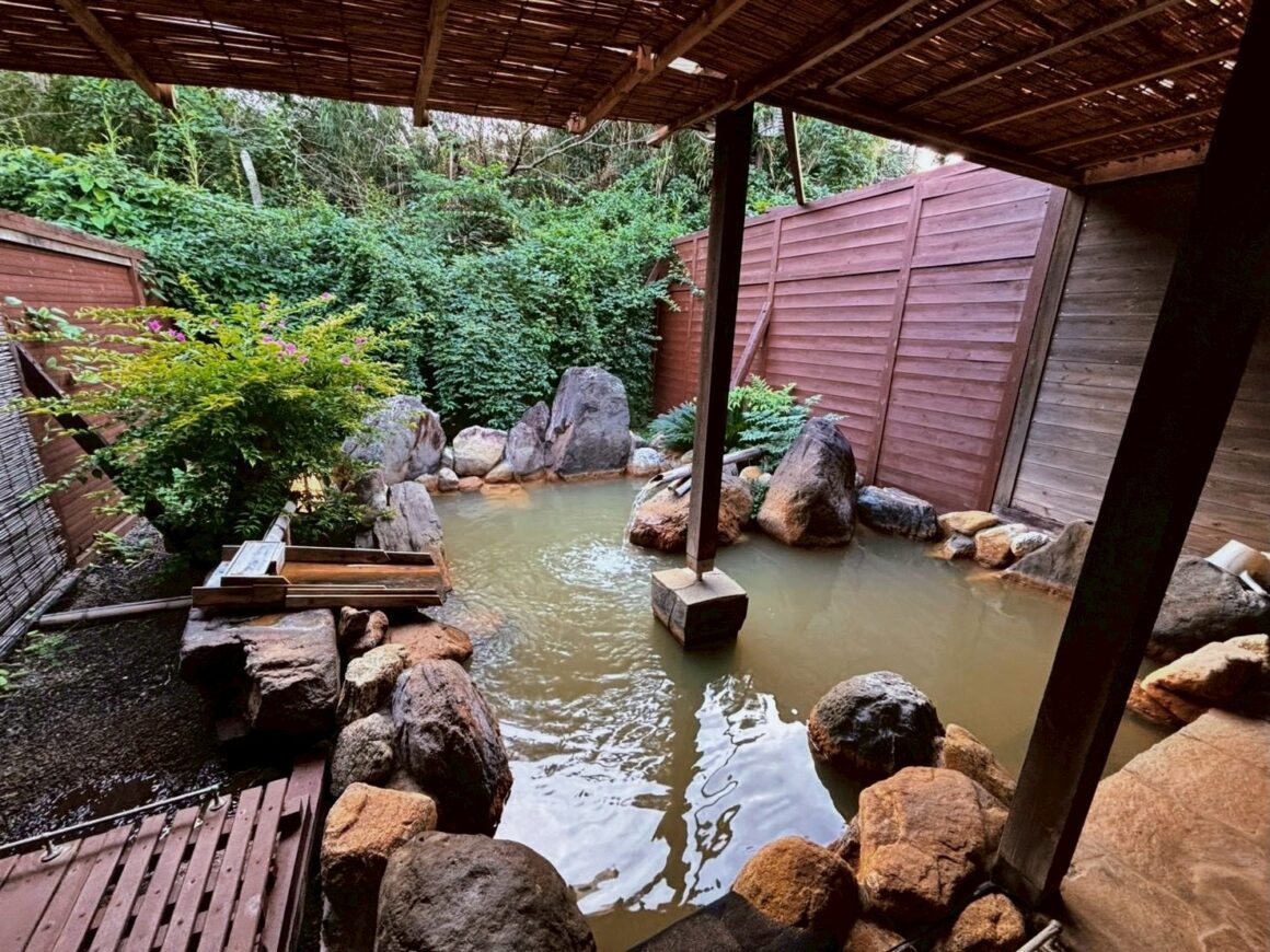 ส่วนบ่อน้ำพุร้อนกลางแจ้งจะตั้งอยู่ด้านนอกของโรงแรมไม่ไกลมากนัก และจะแบ่งเป็นโซนชายหญิงตามช่วงเวลา สำหรับน้ำพุร้อนที่นี่ก็ไหลมาจากแหล่งน้ำธรรมชาติโดยตรงเช่นเดียวกัน นอกจากนี้ เรายังสามารถจองเป็นแบบส่วนตัวได้อีกด้วย