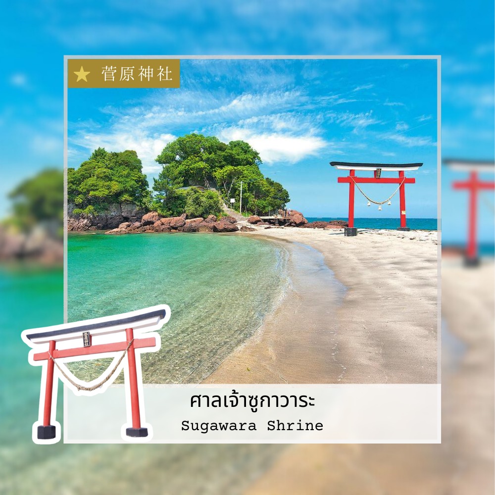 ศาลเจ้าอันงดงามนี้ตั้งอยู่บนโขดหินบนเนินเขาที่ยื่นออกไปในทะเลราวกับเกาะ ศาลเจ้าซูกาวาระเป็นที่ประดิษฐานของเทพเจ้าซูกาวาระ โนะ มิจิซาเนะ (Sugawara Michizane) เทพเจ้าแห่งการเรียนรู้ ดังนั้น ในช่วงปีใหม่และช่วงใกล้สอบ ผู้คนจะเดินทางมาที่นี่เพื่อสักการะและขอพร
