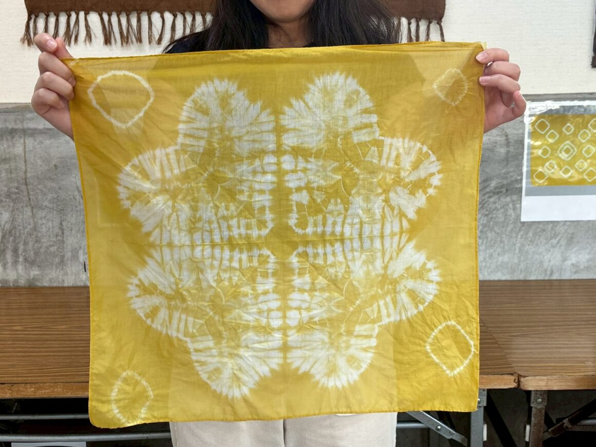 นอกจากการย้อมผ้าเช็ดหน้าแล้วที่นี่ยังมีกิจกรรมการย้อมผ้าคลุมไหล่อีกด้วย หลังจากลองย้อมผ้าแล้วเราสามารถนำกลับบ้านไปได้อีกด้วยค่ะ