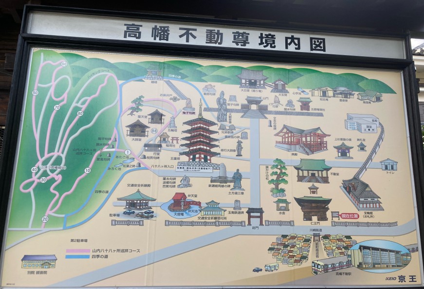 ทางด้านขวาของประตูทางเข้า Nio-Mon จะมีป้ายแผนที่แสดงพื้นที่ของวัดและตำแหน่งของอาคารต่างๆ รวมถึงเส้นทางเดินภูเขาด้วย