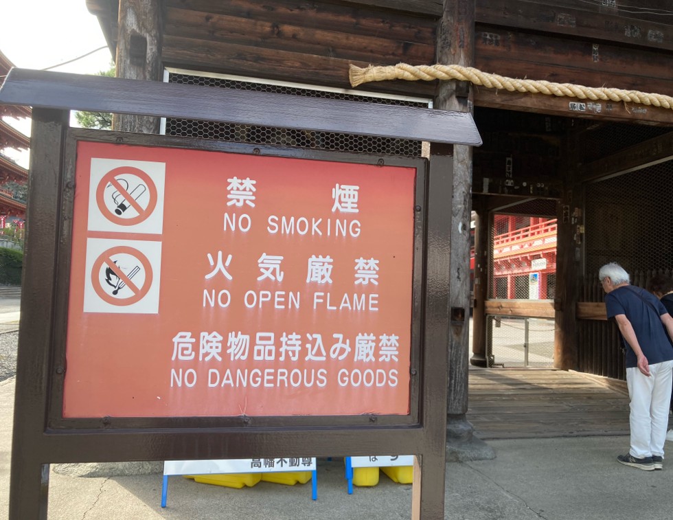 ก่อนเข้ามีป้ายเตือนจากทางวัด หากได้อ่านแล้วก็เดินไปยังหน้าประตูได้เลย ซึ่งทุกคนอาจสังเกตเห็นคุณลุงท่านหนึ่งกำลังยืนโค้งอยู่ด้านหน้า นั่นก็เพราะตามธรรมเนียมของคนญี่ปุ่นจะต้องโค้งก่อนเข้าประตูวัดหรือโทริอิเพื่อเป็นการขออนุญาตเข้าพื้นที่ และเมื่อเดินออกจากวัดก็ให้ทำเช่นเดียวกัน โดยเดินพ้นเขตวัดออกมาจากประตูแล้วให้หันหน้าไปทางวัดและโค้งเพื่อเป็นการบอกเทพเจ้าและสิ่งศักดิสิทธิ์ว่าเรากลับแล้ว