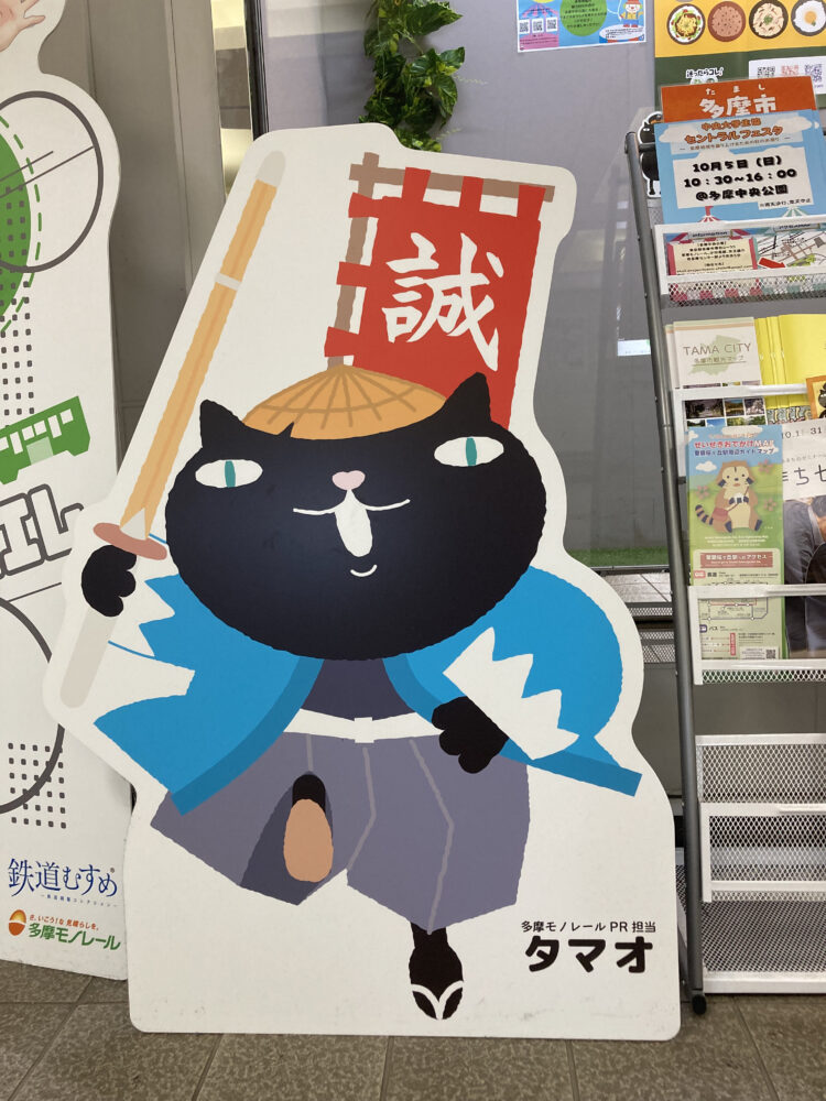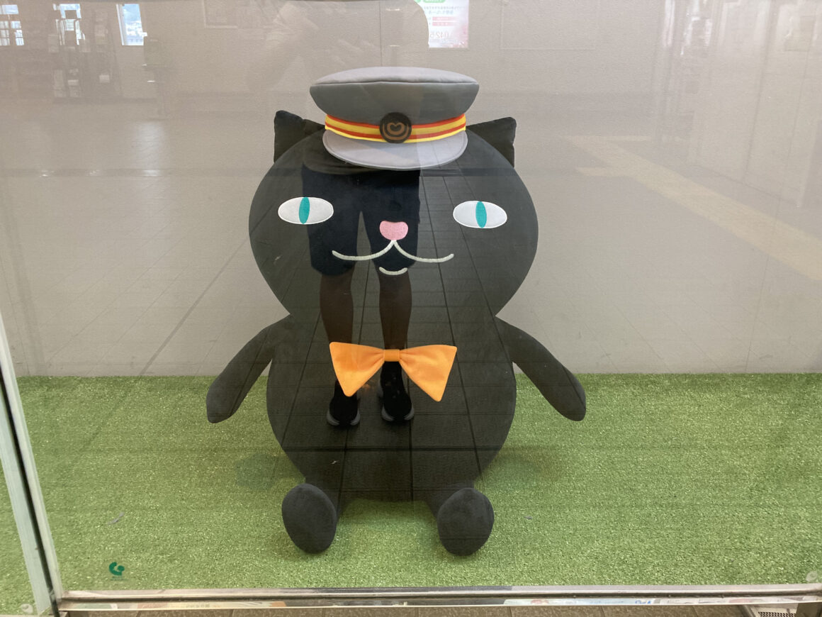 ตุ๊กตาน้องแมวดำในตู้เป็นมาสคอตของ Tama Monorail โดยปกติน้องจะใส่ชุดแบบนี้