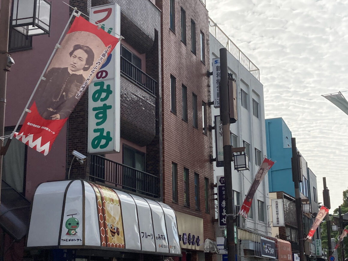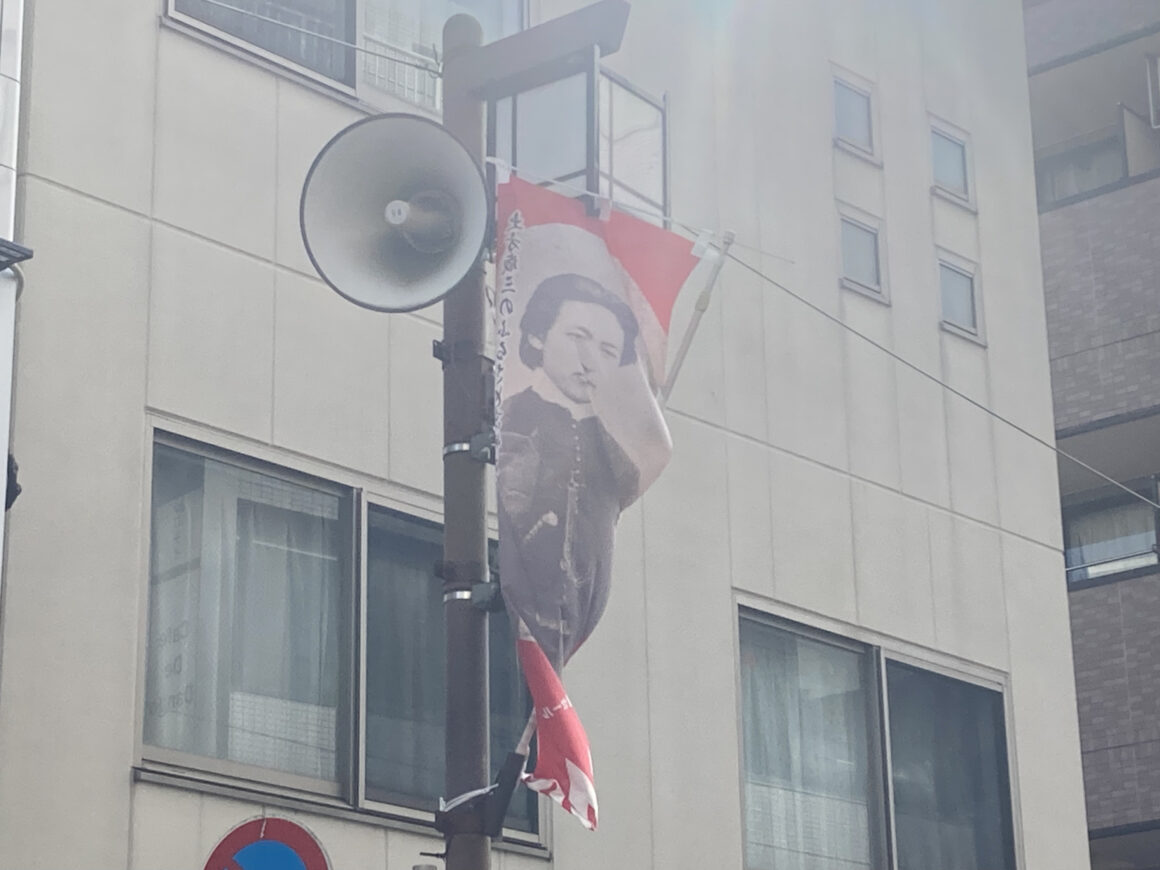 นอกจากนี้ ตอนที่ไป บนเสาไฟในถนนย่านการค้านี้ก็มีการตบแต่งด้วยธงรูปภาพของ ฮิจิคาตะ โทชิโซ (Hijikata Toshizo) ตลอดเส้นทางเลย