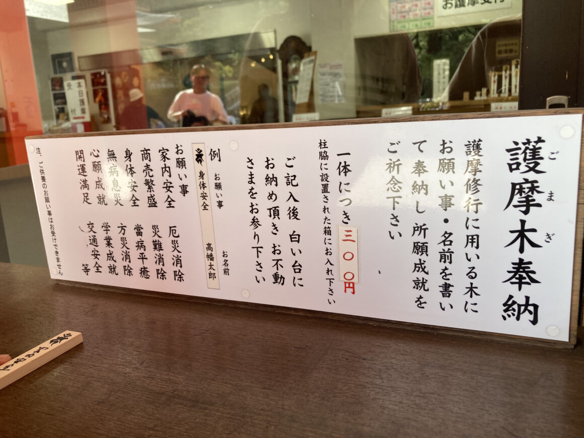 ตรงทางเข้าก็มีให้ทำบุญกับ โกะมากิ (護摩木, Gomagi) ซึ่งเป็นแท่งไม้อธิษฐาน ที่จะนำไปเผาเพื่อประกอบพิธีทางศาสนา ราคาแท่งละ 300 เยน