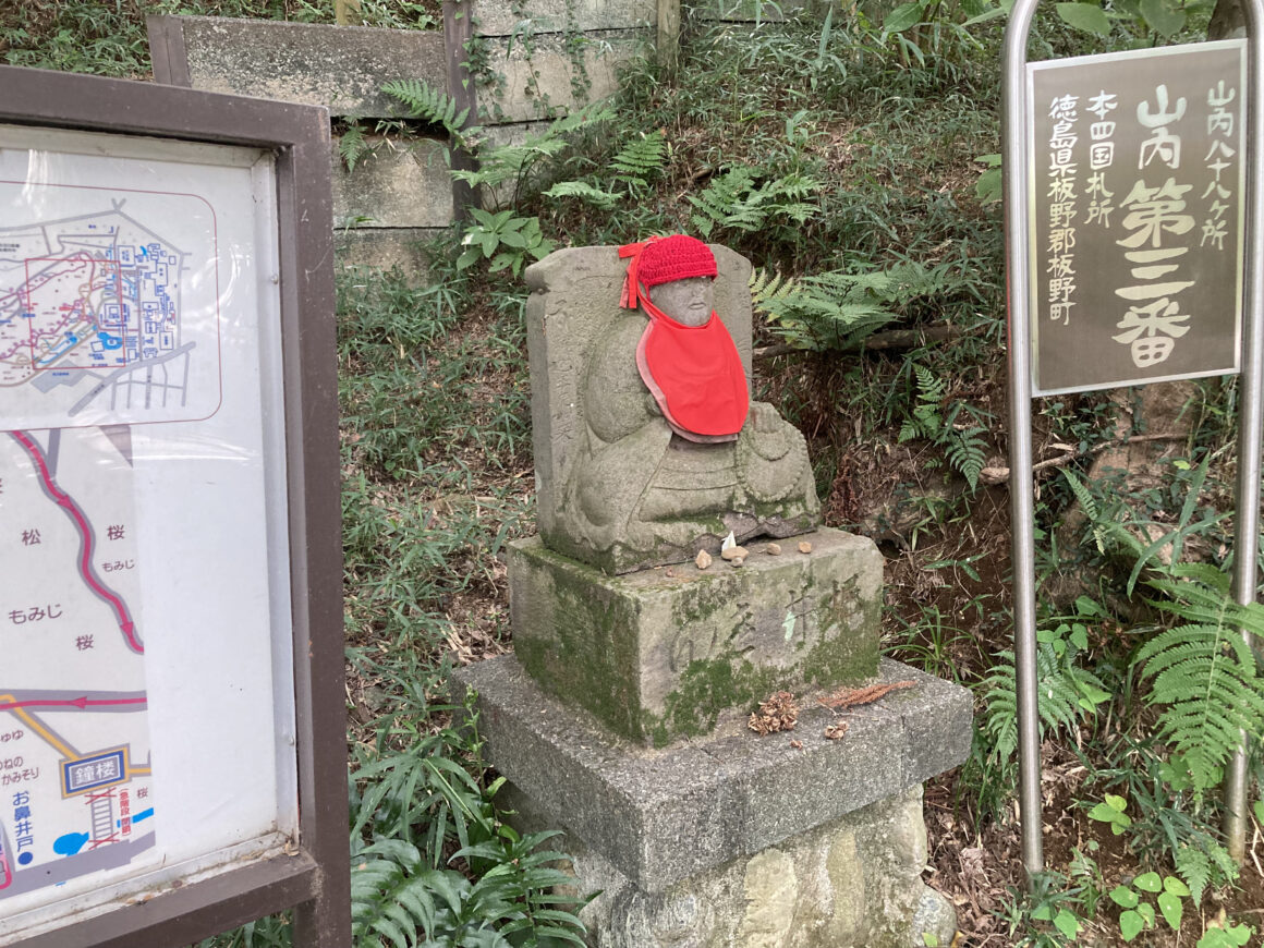 เดินมาเรื่อยๆ ก็จะเจอกับป้ายทางเข้าสู่เส้นทางไหว้เทพเจ้าจิโซ 88 องค์แบบนี้