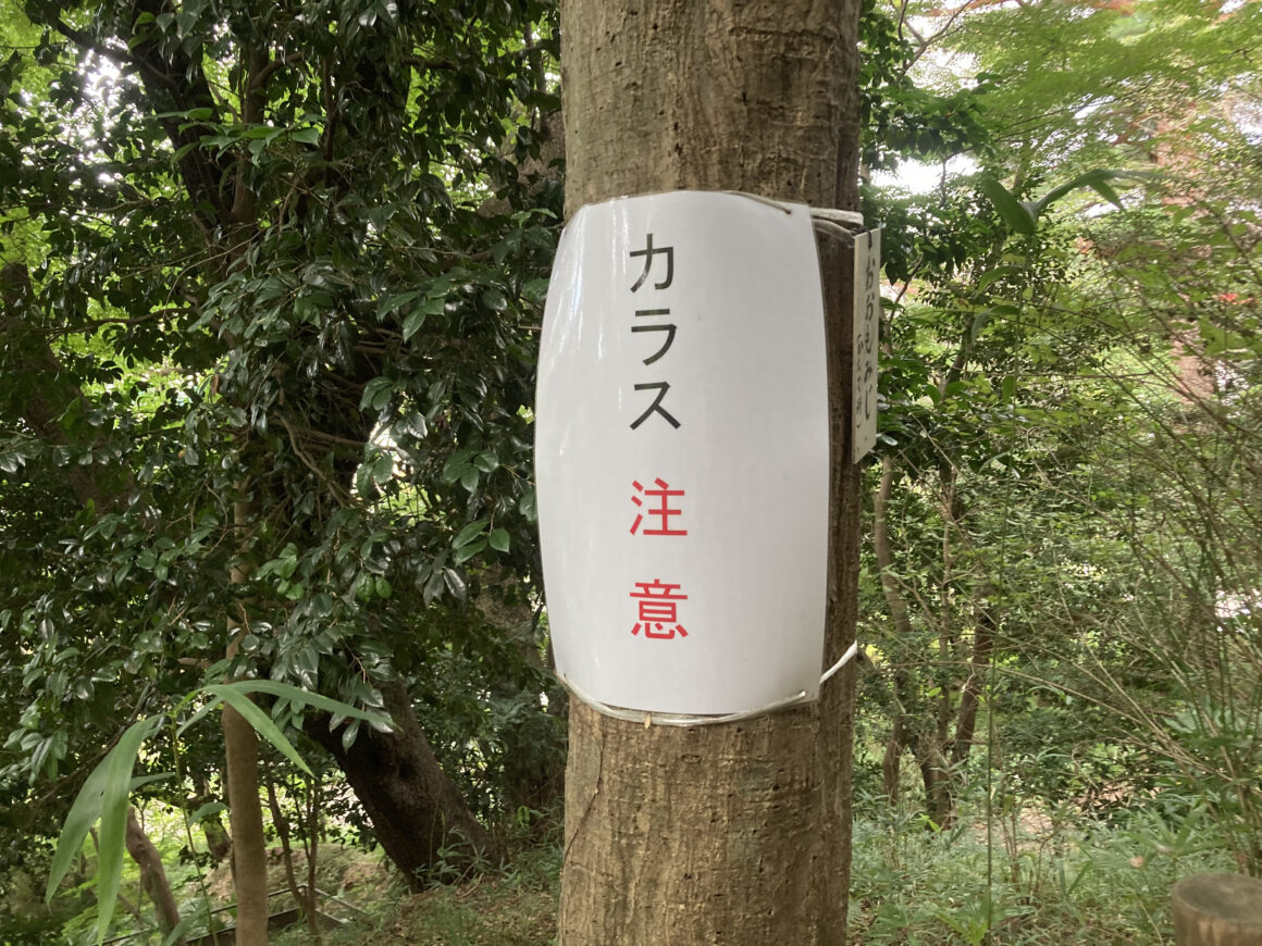 เดินขึ้นเขาไปได้สักพักก็เจอป้ายเขียนเตือนให้ผู้ที่มาเดินสักการะเทพจิโซ “ระวังอีกา” ในช่วงที่ไปไม่ค่อยเห็นหรือได้ยินเสียงอีกาเท่าไหร่ แต่คิดว่าในช่วงที่อากาศร้อนกว่านี้อาจจะมีออกมาบิน เลยให้ระวังจะโดนคาบของหรือแย่งอาหารไป ถ้าใครไปก็ระวังตัวกันด้วยนะ