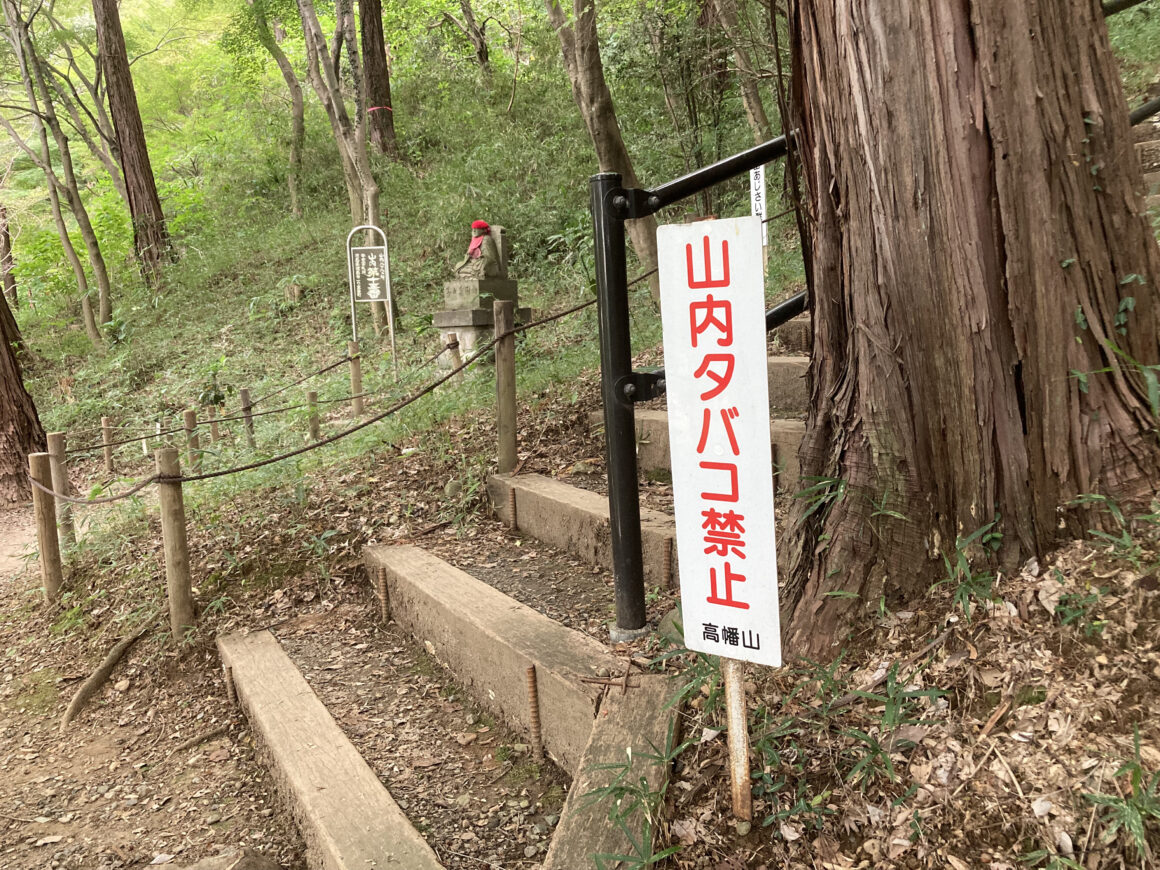 นอกจากให้ระมัดระวังอีกาและสัตว์ในภูเขาแล้ว แน่นอนว่าทางภูเขาแห่งนี้เป็นพื้นที่ของวัดและเป็นพื้นที่สาธารณะ ทางวัดก็มีป้ายเขียนขอความร่วมมือ “ห้ามเดินสูบบุหรี่บนภูเขา” ตามทางแบบนี้