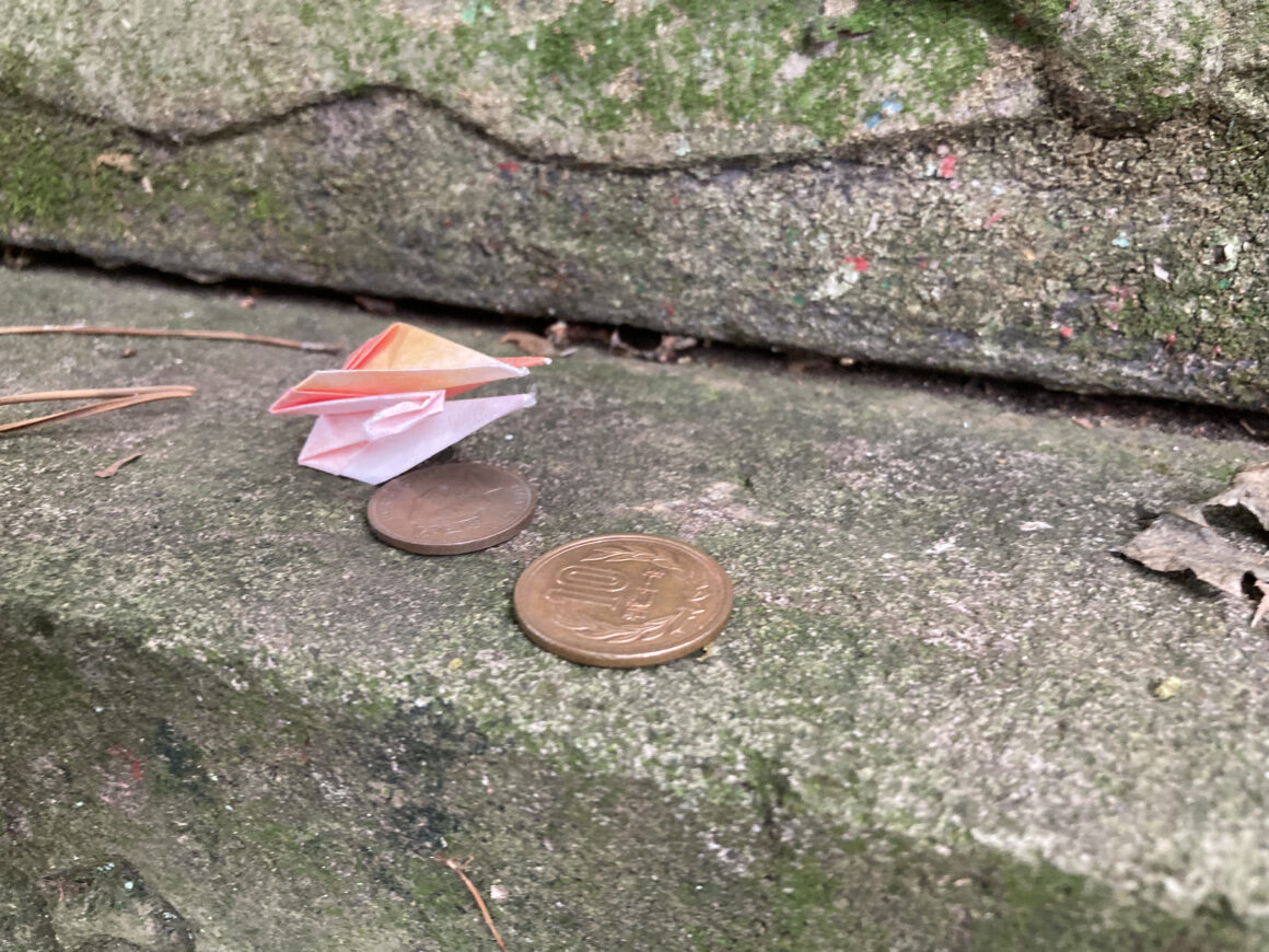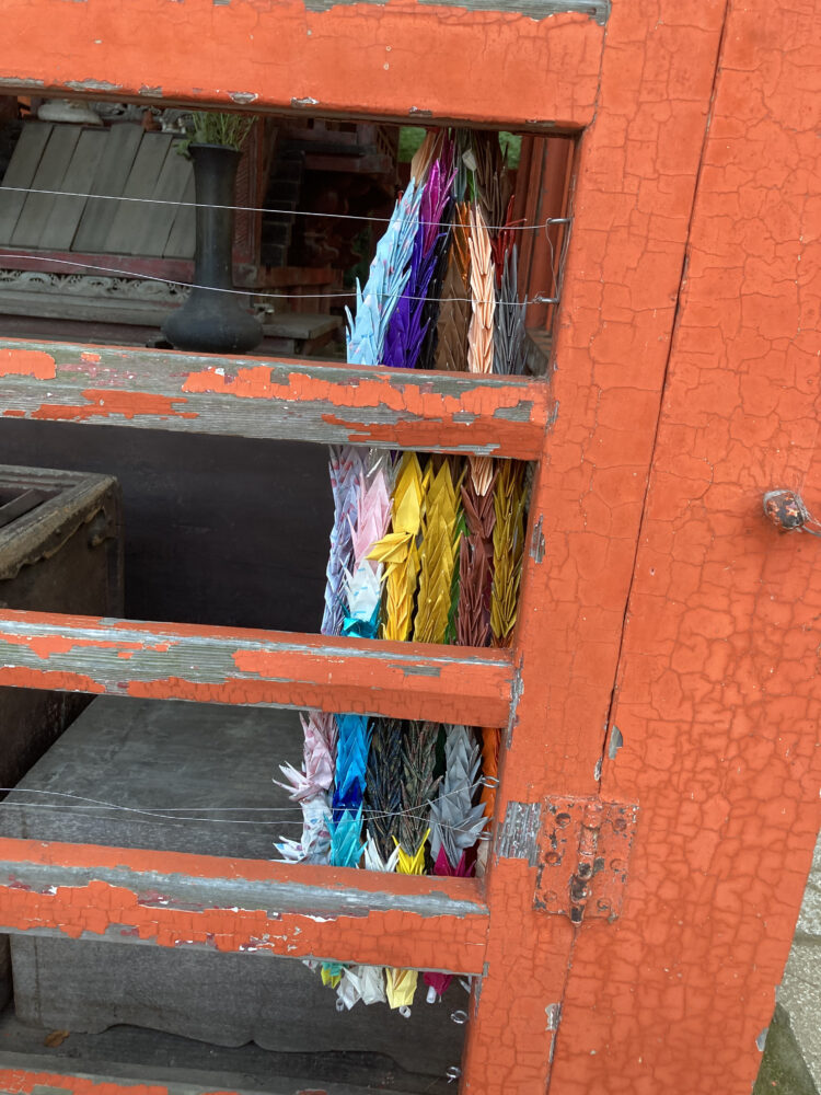พอลองมองดีๆ ด้านในศาลเจ้ามีคนญี่ปุ่นพับนกกระเรียนร้อยเป็นพวงยาวมาถวายด้วย