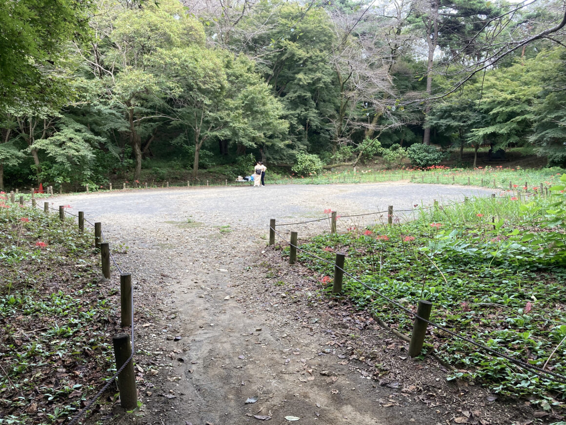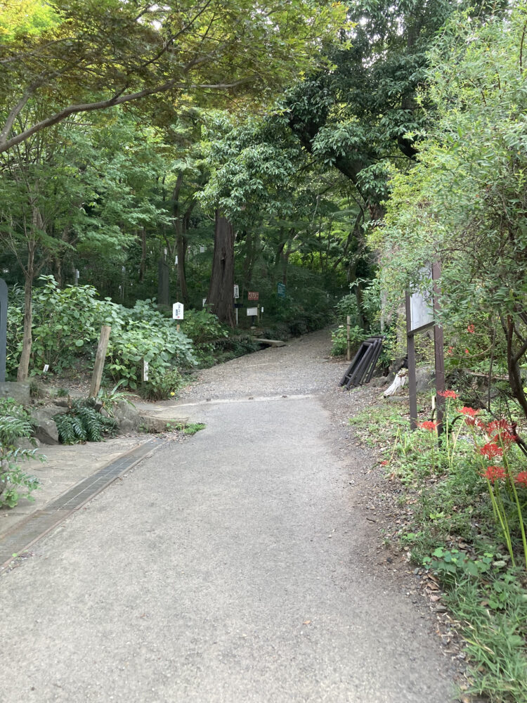 พอเดินไปอีกหน่อยก็จะเป็นทางที่จะพาเราไปยังสวนดอกไม้ แต่น่าเสียดายตอนที่เราไปเป็นช่วงที่ไม่ค่อยมีดอกไม้บานเท่าไหร่ จะมีดอกฮิกันบานะบานอยู่แบบหร็อมแหร็ม แต่ก็มีคนแต่งชุดกิโมโนมาเพื่อถ่ายรูปอยู่เหมือนกัน แสดงว่าช่วงฤดูใบไม้ผลิและช่วงใบไม้เปลี่ยนสีน่าจะเป็นสถานที่ที่ได้รับความนิยมอยู่เหมือนกัน