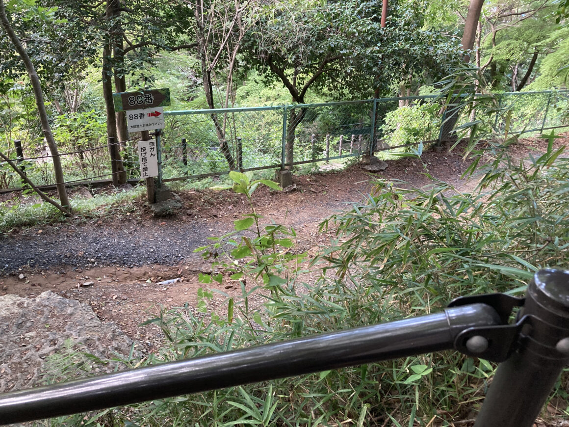 ทางเดินจากตรงนี้ไปขึ้นเขาจะเป็นพื้นดินที่ไม่ได้มีการเทปูนเอาไว้ และเส้นทางจนกว่าจะครบทั้ง 88 องค์ค่อนข้างไกลและมีการเดินขึ้นลงเนินเป็นบางครั้งด้วย แนะนำให้สวมรองเท้าที่พร้อมไปลุยธรรมชาติ หรือรองเท้าพละก็ได้ เพราะว่าวันนั้นเราก็ใส่รองเท้าพละทั่วไปก็เดินได้อยู่!