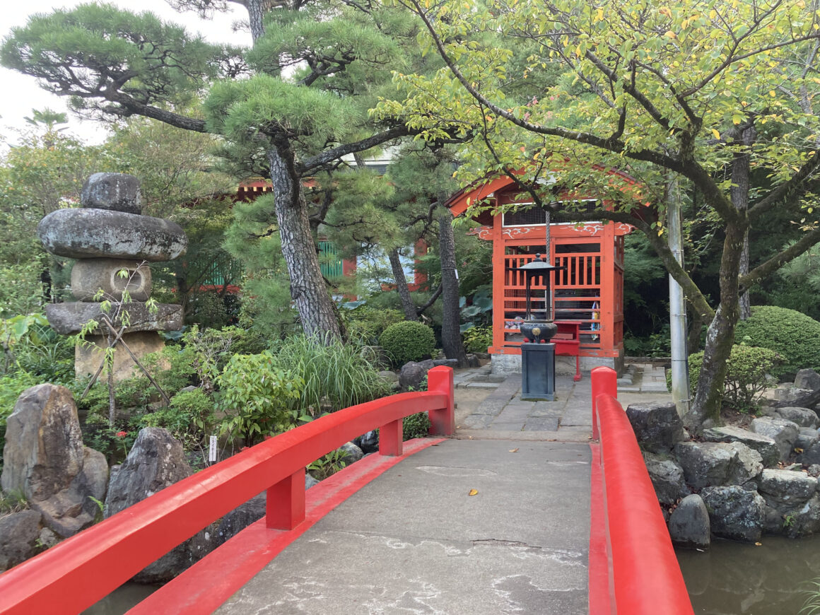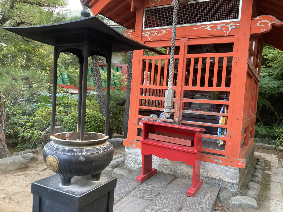 เมื่อเดินข้ามสะพานไปก็จะเจอกับศาลเล็กๆ ที่คนจะมากราบไหว้ สามารถจุดธูปไหว้ได้ด้วยเช่นกัน โดยจะมีวางมัดธูปให้เรามาจุดไหว้ได้ มัดละ 100 เยน