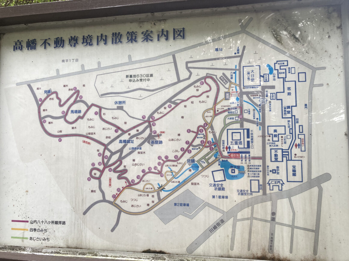มีป้ายแผนที่ให้เห็นภาพรวมด้วย โดยเราจะเริ่มเดินทางหมายเลข 1 กัน แม้จะไม่มีแผนที่ก็ไม่ต้องห่วงว่าจะหลงทาง เพราะว่าระหว่างทางจะมีป้ายบอกทางและในบางจุดจะมีทางลัดให้เราลงเขาก่อนวนครบ 88 องค์ด้วย
