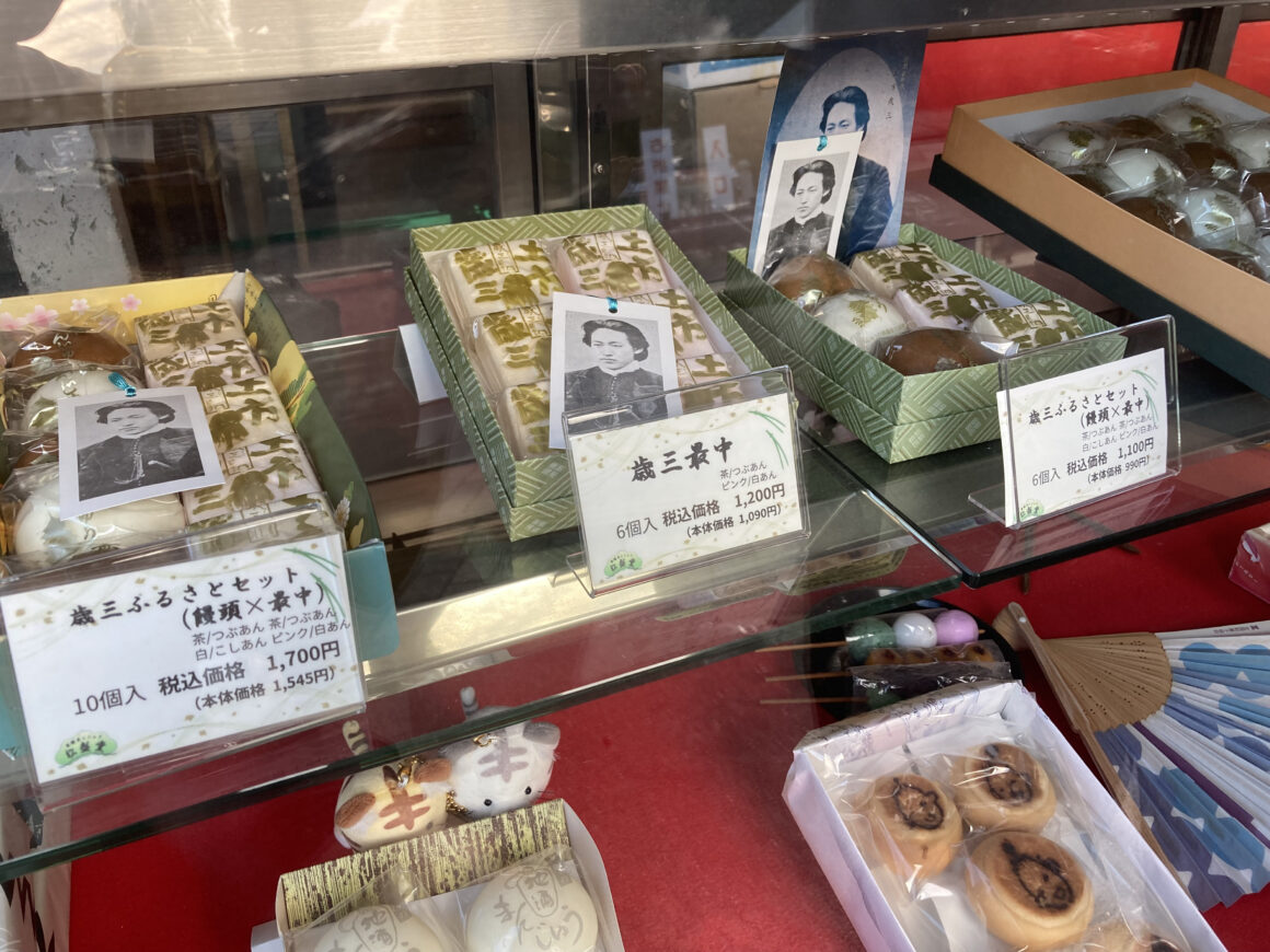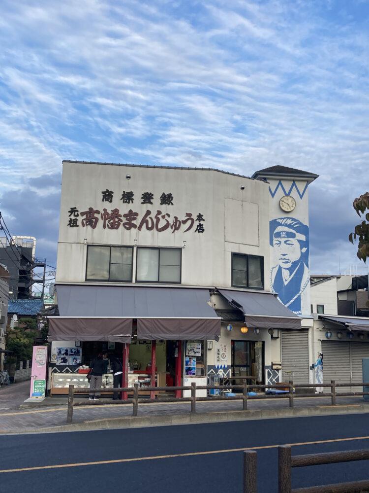 ร้านขนมที่จะพาไปคือร้านขนมมันจูเก่าแก่ 100 ปี ซึ่งตั้งอยู่ตรงข้ามวัด Takahata-Fudoson เลย เมื่อเราเดินข้ามทางม้าลายกลับไปทางเดิมที่เรามาแล้วก็เดินเลาะฟุตบาทไปทางขวาก็จะเจอกับร้าน “ทาคาฮาตะ มันจู มัตสึเซโด สาขาหลัก (高幡まんじゅう松盛堂 本店)” ซึ่งหน้าตาแบบนี้ จะมีรูปของ ฮิจิคาตะ โทชิโซ เด่นสะดุดตาใหญ่ๆ อยู่บนตึกเลย