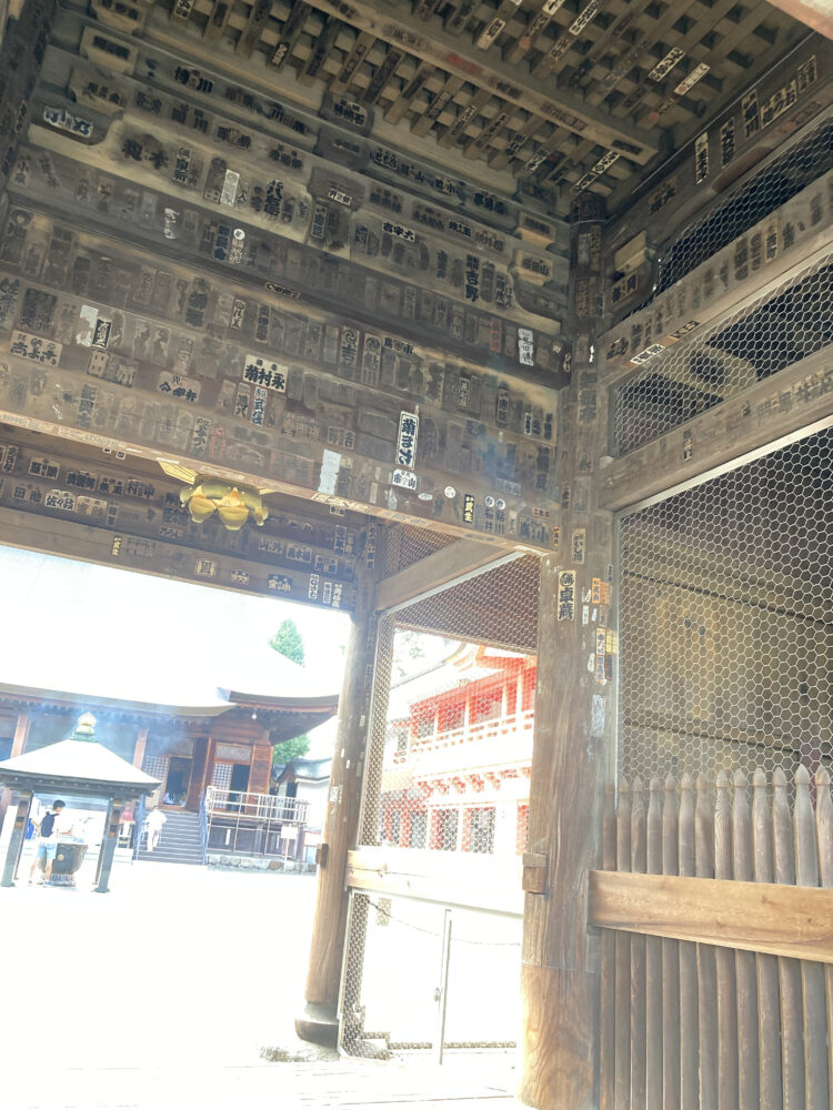 ประตูนิโอมง (Nio-Mon) จะมียักษ์เฝ้าทางเข้าอยู่ทั้งทางซ้ายและขวา โดยประตูแห่งนี้สร้างจากไม้ และภายในมีการติดแผ่น Senshafuda (千社札) เอาไว้ด้วย ซึ่งเป็นแผ่นสติกเกอร์ที่เขียนชื่อของผู้ที่มาเยือนเอาไว้ แปะไว้เหมือนกับว่าตนเองได้มาที่วัดนี้แล้ว แต่หากจะติดจะต้องไปขออนุญาตเจ้าหน้าที่วัดก่อน ไม่สามารถติดเองได้โดยพละการ เพราะว่าในปัจจุบันบางวัดไม่อนุญาตให้ติดแล้วด้วย