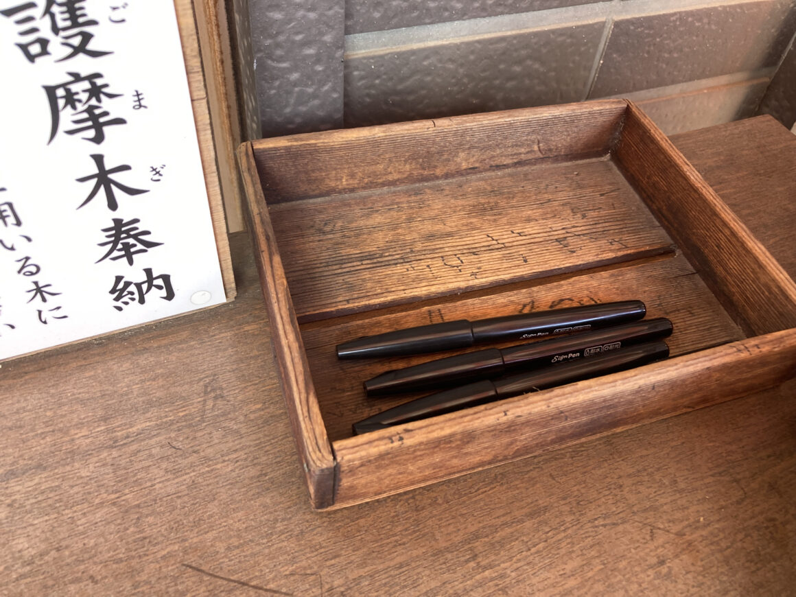 เราเลยถือโอกาสร่วมทำบุญในครั้งนี้ด้วยเลย ซึ่งทางวัดจะจัดเตรียมวางปากกาและแท่งไม้เอาไว้ให้เขียนแบบญี่ปุ่นเรียงลงมาจากด้านบน เป็นคำอธิฐานของเรา ซึ่งสามารถดูจากป้ายของทางวัดได้เช่นกัน จากนั้นก็เขียนชื่อของเรา หากต้องการเขียนชื่อหลายคนในครอบครัวในแผ่นเดียวก็ได้ หรือจะเขียนแค่นามสกุลก็ได้เช่นกัน