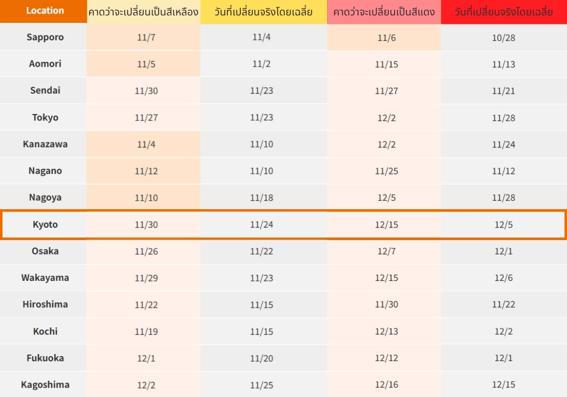 ก่อนอื่น เรามาเช็คพยากรณ์ใบไม้เปลี่ยนสีที่เกียวโตกันก่อนค่ะ (ข้อมูล ณ วันที่ 4 พ.ย. 2025)