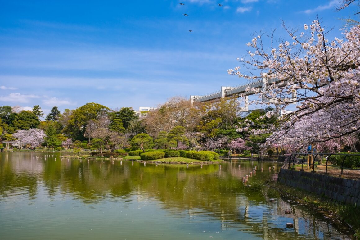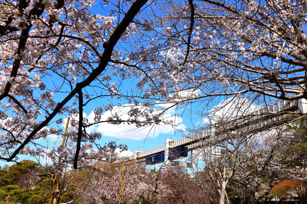 จากสวนยังสามารถมองเห็นวิวรถไฟโมโนเรลวิ่งผ่านอีกด้วย แอบกระซิบ! วิวซากุระที่เห็นลงมาจากรถไฟโมโนเรลก็สวยไม่แพ้กันเลยล่ะ!