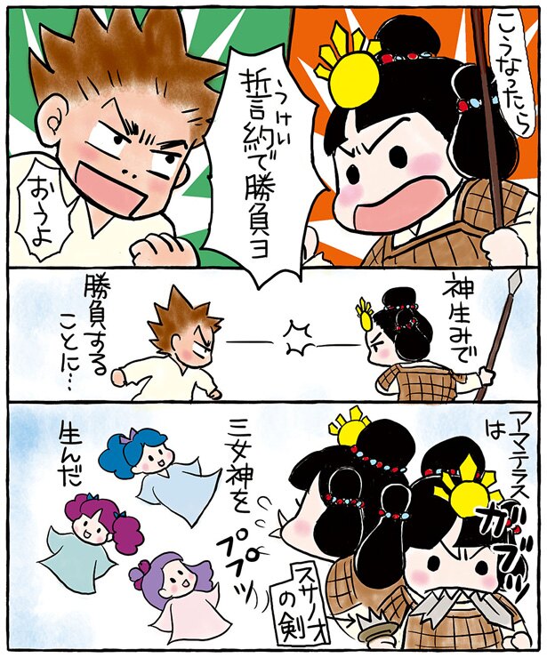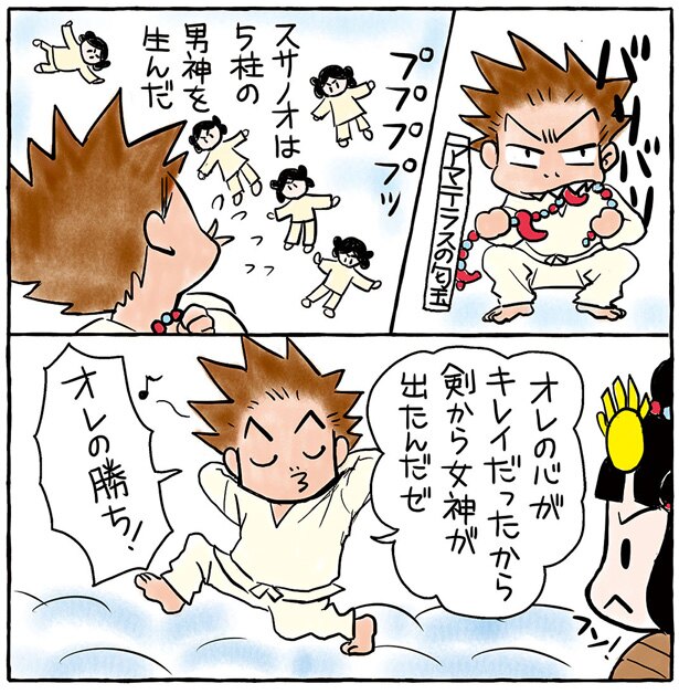ส่วนเทพซูซาโนะโอะนั้นเอาสร้อยคอของเทพีอาเทราสึมาเสกเป็นเทพ 5 องค์ ซึ่งบางตำนานบอกว่าเทพีอามาเทราสึยอมรับว่าเทพซูซาโนะโอะชนะในการดวลกันครั้งนี้ แต่เทพซูซาโนะโอะเป็นผู้ชนะที่พาล ท่านจึงอาละวาดทำลายล้างไปทั่ว จนเทพีอามาเทราสึโมโหก็เลยหนีไปอยู่ในถ้ำ จนทำให้โลกมืดมิดและเดือดร้อนกันไปหมดเพราะโลกไร้แสงอาทิตย์