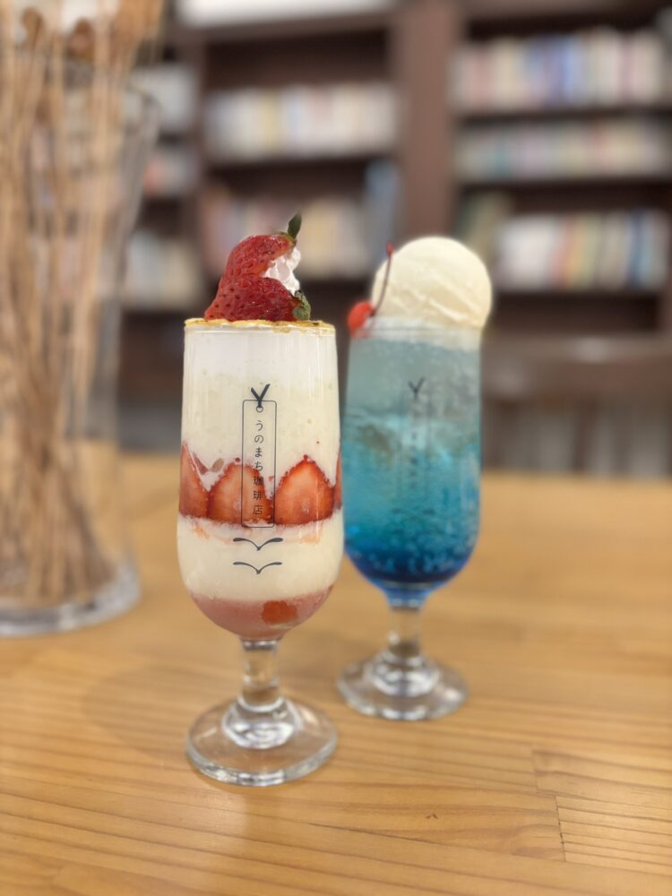 想要品嚐清爽甜品,推薦去這間「うのまち珈琲店」。在被書本包圍的咖啡館裡,飄散著書本墨香的空氣,安靜而溫馨的空間讓人能身心放鬆。坐下來點一份「當季水果芭菲」,或者是一杯「色彩鮮艷香草蘇打」一邊享受甜品,一邊度過悠閒時光。